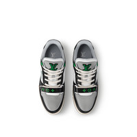 This richly detailed interpretation of the iconic LV Trainer sneaker combines smooth and grained calf leather with Monogram canvas. Inspired by vintage basketball sneakers, this model is notable for its elaborately constructed upper, which takes seven hours to stitch. Among its multiple signatures are a large Monogram Flower on the side and asymmetric Louis and Vuitton signatures on the back. - Green - Calf leather, grained calf leather and Monogram canvas - Adjustable velcro strap - 7 hours of stitching for one pair - Rubber outsole - LV Initials on the tongue - Monogram Flower and Louis Vuitton script signature on the side - Louis and Vuitton signatures on the back - Monogram Flowers on the strap and outsole - Made in Italy