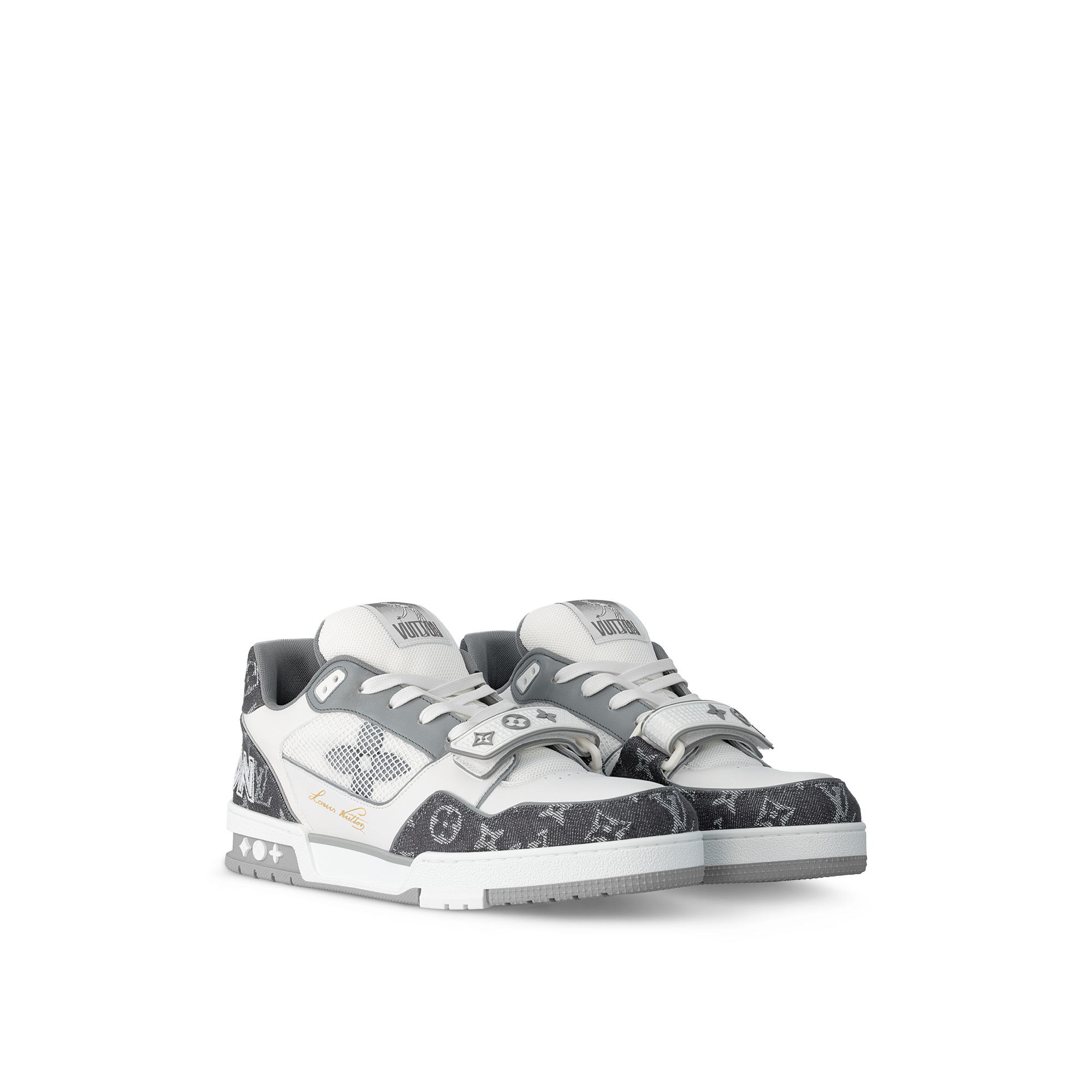 This reinterpretation of the iconic LV Trainer sneaker comes in a mix of materials, including Monogram denim and technical mesh. Its upper features rich detailing, including Louis Vuitton in script lettering on the side and an embroidered Vuitton signature at the back. Monogram Flowers decorate both the rubber outsole and the adjustable velcro strap. - Gray - Mix of materials - Laces/Adjustable velcro strap - Rubber signatures - 7 hours of stitching for one pair - Rubber outsole with Monogram Flowers - Made in Italy