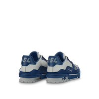 The LV Trainer sneaker comes in a bicolor version combining smooth calf leather with Louis Vuitton's emblematic Epi calf leather, recognizable for its distinctive grain. This model, which was inspired by vintage basketball sneakers, is notable for its rich detailing, including the Louis Vuitton script signature, embossed in silver on the side. Detailed Features - Navy Blue - Epi calf leather and calf leather - 7 hours of stitching for one pair - Rubber outsole - LV Initials on the tongue and side - Louis Vuitton script signature on the side - #54 signature on the back - Monogram Flowers on the outsole - Made in Italy