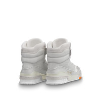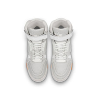 The LV Trainer sneaker boot is an avant-garde hi-top crafted from grained calf leather in pale-gray Nuage. It features a padded collar and a velcro strap marked "Advanced Tech System". The Louis Vuitton script signature is printed on the side, while "408" refers to August 4, Louis Vuitton's date of birth. Detailed Features - Grained calf leather - Nuage White - Rubber outsole with micro insert - Louis Vuitton script signature - Monogram Flowers on the outsole - Made in Italy