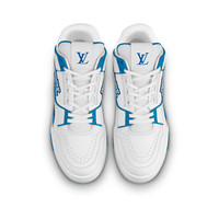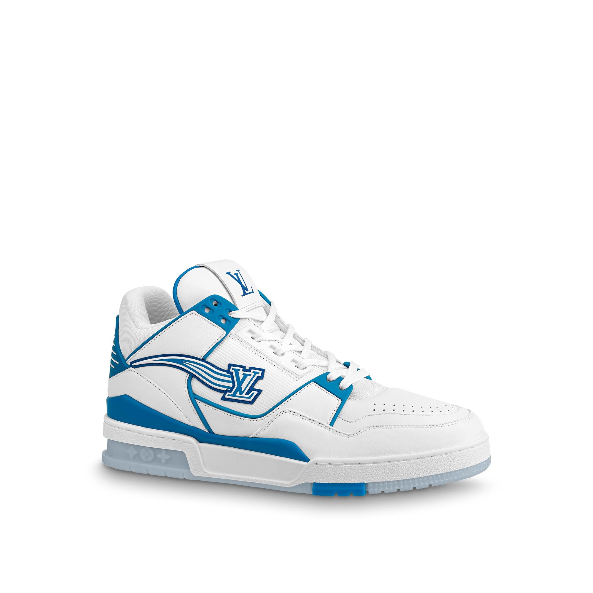 Inspired by Louis Vuitton's Fall-Winter 2020 show, this version of the iconic LV Trainer sneaker comes in white calf leather with flashes of blue. A reinterpretation of a classic basketball sneaker, this model features the new LV Initials signature on both sides. Its innovative, gel-injected outsole is decorated with motifs of Monogram Flowers. Detailed Features - Azur Blue - Calf leather - 7 hours of stitching for one pair - Rubber outsole - New LV Initials signature on both sides - LV Initials on the tongue - Monogram Flowers on the outsole - Made in Italy
