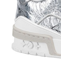 A favorite of Louis Vuitton Artistic Director Virgil Abloh, the LV Trainer sneaker is revisited this season in metallic silver leather. The Louis Vuitton script signature, written by Virgil Abloh, appears on the side of this cult model, which was inspired by basketball sneakers. It is finished with an innovative, gel-injected outsole for extra comfort. Detailed Features - Silver - Metallic calf leather - 7 hours of stitching for one pair - Rubber outsole - LV Initials on the tongue and side - Louis Vuitton script signature on the side - Louis and Vuitton signature on the back - Monogram Flowers on the outsole - Made in Italy