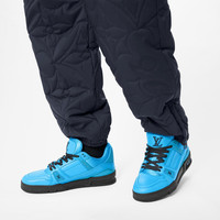 The cult LV Trainer sneaker is revisited this season in bright colors as part of the Rainbow ready-to-wear capsule collection. Crafted from supple calf leather, its elaborate upper takes Louis Vuitton artisans seven hours to stitch. Created by Artistic Director Virgil Abloh, this vintage-inspired design features an innovative, gel-injected outsole decorated with Monogram Flowers. Detailed Features - Blue - Calf leather - 7 hours of stitching for one pair - Rubber outsole - LV Initials on the tongue, back and side - Vuitton signature on the side - Monogram Flowers on the outsole - Made in Italy