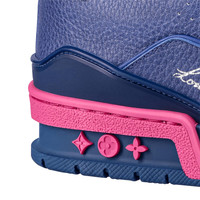 For the Louis Vuitton Spring-Summer 2022 show collection, the LV Trainer sneaker is revisited in grained calf leather with a colorful tie-dye effect, matching the season's Illusion Monogram theme. Inspired by vintage basketball sneakers, this iconic model, designed by Artistic Director Virgil Abloh, has an elaborately constructed upper which takes seven hours to stitch. Detailed Features - Pink - Grained calf leather - 7 hours of stitching for one pair - Rubber outsole - LV Initials on the tongue and side - Louis Vuitton script signature on the side - #54 signature on the back - Monogram Flowers on the outsole - Made in Italy