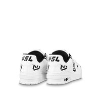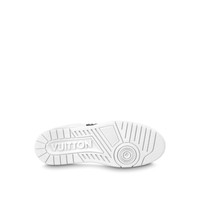 This eco-designed version of the LV Trainer sneaker is made with 90% sustainable materials, including recycled polyester and bio-based materials for the upper, and recycled polyurethane for the outsole. The LV sustainability logo is used as a print on the upper, which is also signed with the LV Initials in rubber-like, recycled polyurethane. This iconic model was designed by Virgil Abloh, who drew inspiration from vintage basketball sneakers. Detailed Features - Black - Mix of sustainable materials - Recycled polyester and bio-based upper - 100% recycled polyester laces - 93% recycled polyurethane outsole - LV sustainability logo on the upper - LV Initials made with recycled polyurethane on the tongue and side - #54 signature on the back - Monogram Flowers on the outsole - Made in Italy