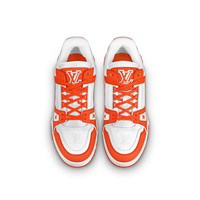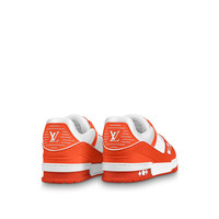 Inspired by basketball sneakers and designed by Virgil Abloh, the iconic LV Trainer sneaker is revisited this season in a bold color palette. The upper in grained calf leather is discreetly embossed with the Monogram pattern. This richly detailed design is notable for its innovative gel-injected outsole, which provides extra comfort. Detailed Features - Orange - Monogram-embossed grained calf leather - 7 hours of stitching for one pair - Rubber outsole - Vuitton signature on the side - LV Initials on the tongue - Monogram Flowers on the outsole - Made in Italy
