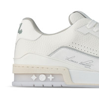 This monochrome version of the LV Trainer sneaker combines smooth and grained calf leather. Inspired by vintage basketball sneakers, this cult model was designed by Artistic Director Virgil Abloh, whose handwritten Louis Vuitton signature is embossed on the side. The #54 signature at the back refers to 1854, the year the House was founded. - White - Grained calf leather - 7 hours of stitching for one pair - Rubber outsole - LV Initials on the tongue and side - Louis Vuitton script signature on the side - #54 signature on the back - Monogram Flowers on the outsole - Made in Italy