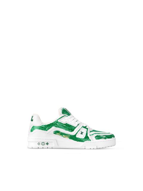 This seasonal version of the LV Trainer sneaker comes in supple calf leather printed with a colored-in motif that coordinates with the ready-to-wear collection. Designed by Louis Vuitton Artistic Director Virgil Abloh, this iconic style was inspired by basketball sneakers. This cult sneaker is notable for its elaborately constructed upper, which takes seven hours to stitch, and for its rich details, including the Louis Vuitton script signature on the side. - Green - Printed calf leather - 7 hours of stitching for one pair - Rubber outsole - LV Initials on the tongue and side - Louis Vuitton script signature on the side - #54 signature on the back - Monogram Flowers on the outsole - Made in Italy