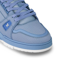 This colorful interpretation of the LV Trainer sneaker comes in grained calf leather and is also available in women's sizes. This cult model was originally designed by Virgil Abloh, who drew inspiration from vintage basketball sneakers. It features an elaborately constructed upper, which takes seven hours to stitch, and a technical outsole decorated with Monogram Flowers. - Blue - Grained calf leather - 7 hours of stitching for one pair - Rubber outsole - LV Initials on the tongue and side - Vuitton signature on the side - Monogram Flowers on the outsole - Available in women's sizes - Made in Italy