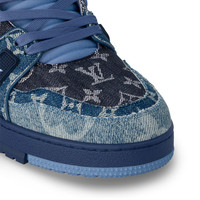 This version of the LV Trainer sneaker comes in a patchwork of Monogram denim with a refined play on color and scale. This iconic style, which was originally designed by Virgil Abloh, references vintage basketball sneakers. Its elaborately constructed upper, which takes Louis Vuitton artisans seven hours to stitch, is complemented by a bicolor rubber outsole. - Blue - Monogram denim - 7 hours of stitching for one pair - Rubber outsole - LV Initials on the tongue and side - Louis Vuitton script signature on the side - Monogram Flower on the back - Monogram Flowers on the outsole - Made in Italy