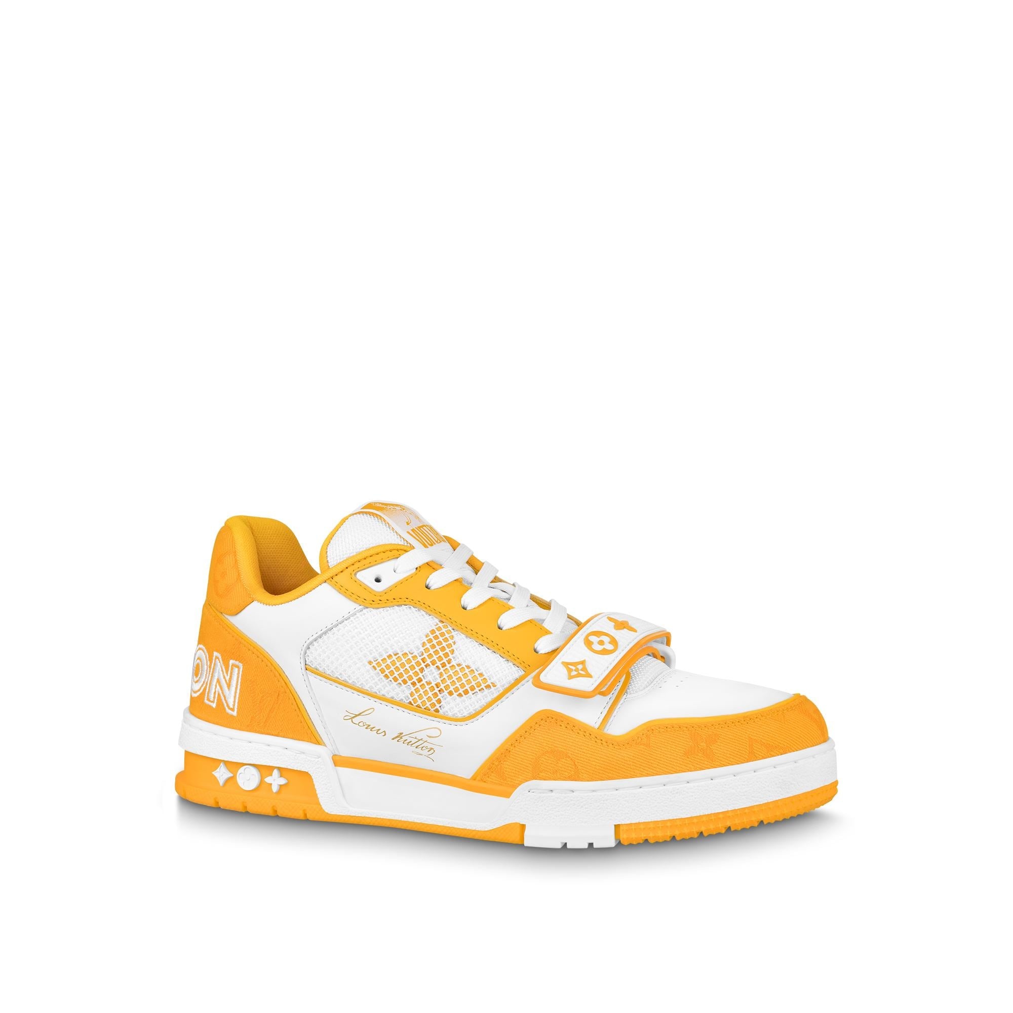Designed for Louis Vuitton by Virgil Abloh, and inspired by vintage basketball sneakers, the LV Trainer sneaker is an icon of the shoe collection. This version comes in Monogram denim and features a velcro strap with injected Monogram Flowers. The elaborate construction of the upper takes Louis Vuitton artisans seven hours to stitch. Detailed Features - Yellow - Monogram denim - Velcro strap - 7 hours of stitching for one pair - Rubber outsole - Vuitton signature on the tongue and back - Louis Vuitton script signature on the side - Monogram Flowers on the strap and outsole - Made in Italy