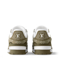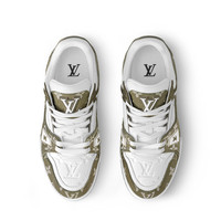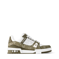This edition of the LV Trainer sneaker combines Monogram denim with Monogram grained calf leather. The juxtaposition of two colors and two materials highlights the elaborately constructed upper of this cult sneaker, which was originally designed by Virgil Abloh. It is complemented by rubber LV Initials and Vuitton signatures and a two-tone rubber outsole. - Khaki Green - Monogram denim/Monogram grained calf leather - Laces - Rubber signatures - Rubber outsole with Monogram Flowers - Made in Italy