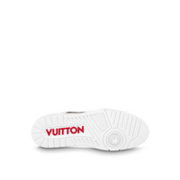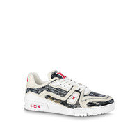This seasonal version of the LV Trainer sneaker comes in supple calf leather printed with a colored-in motif that coordinates with the ready-to-wear collection. Designed by Louis Vuitton Artistic Director Virgil Abloh, this iconic style was inspired by basketball sneakers. This cult sneaker is notable for its elaborately constructed upper, which takes seven hours to stitch, and for its rich details, including the Louis Vuitton script signature on the side. Detailed Features - Black - Printed calf leather - 7 hours of stitching for one pair - Rubber outsole - LV Initials on the tongue and side - Louis Vuitton script signature on the side - #54 signature on the back - Monogram Flowers on the outsole - Made in Italy