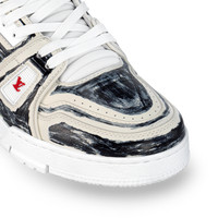 This seasonal version of the LV Trainer sneaker comes in supple calf leather printed with a colored-in motif that coordinates with the ready-to-wear collection. Designed by Louis Vuitton Artistic Director Virgil Abloh, this iconic style was inspired by basketball sneakers. This cult sneaker is notable for its elaborately constructed upper, which takes seven hours to stitch, and for its rich details, including the Louis Vuitton script signature on the side. - Black - Printed calf leather - 7 hours of stitching for one pair - Rubber outsole - LV Initials on the tongue and side - Louis Vuitton script signature on the side - #54 signature on the back - Monogram Flowers on the outsole - Made in Italy