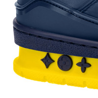 This edition of the LV Trainer sneaker comes in smooth calf leather printed with bold yellow graphics created by Virgil Abloh. The design is complemented by yellow laces and a bicolor outsole, which is decorated with Monogram Flowers. This model is signed with the LV Initials on the tongue and side, and the #54 signature on the back. Detailed Features - Navy Blue - Printed calf leather - 7 hours of stitching for one pair - Rubber outsole - LV Initials on the tongue and side - #54 signature on the back - Monogram Flowers on the outsole - Made in Italy