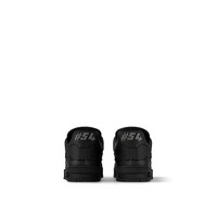 The iconic LV Trainer sneaker is revisited in grained calf leather with details in silver-toned metal, including tiny studs and the LV Initials. Originally designed by Virgil Abloh, this model was inspired by vintage basketball sneakers. It bears the Louis Vuitton script signature on the side, while the technical rubber outsole is decorated with Monogram Flowers. - Black - Grained calf leather - Laces - Metal signatures - 7 hours of stitching for one pair - Rubber outsole with Monogram Flowers - Made in Italy