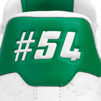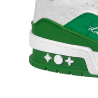 This version of the LV Trainer sneaker combines Monogram leather with calfskin embossed with the Mini Monogram pattern. Designed by Virgil Abloh, this iconic model was inspired by vintage basketball sneakers. Its elaborately constructed upper, which is notable for its rich detailing and Louis Vuitton signatures, takes seven hours to stitch. - Green - Mini Monogram-embossed calf leather and Monogram leather - 7 hours of stitching for one pair - Rubber outsole - LV Initials on the tongue and side - Louis Vuitton script signature on the side - #54 signature on the back - Monogram Flowers on the outsole - Made in Italy