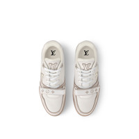The iconic LV Trainer sneaker is reinterpreted this season in a combination of plain and Monogram-patterned calf leather. In addition to laces, this model has an adjustable velcro strap decorated with Monogram Flowers, while a large Monogram Flower also features on the side. The back of the sneaker bears an asymmetrical Louis and Vuitton signature. - Beige - Monogram calf leather - Laces/Adjustable velcro strap - Signature details - Rubber outsole with Monogram Flowers - Made in Italy