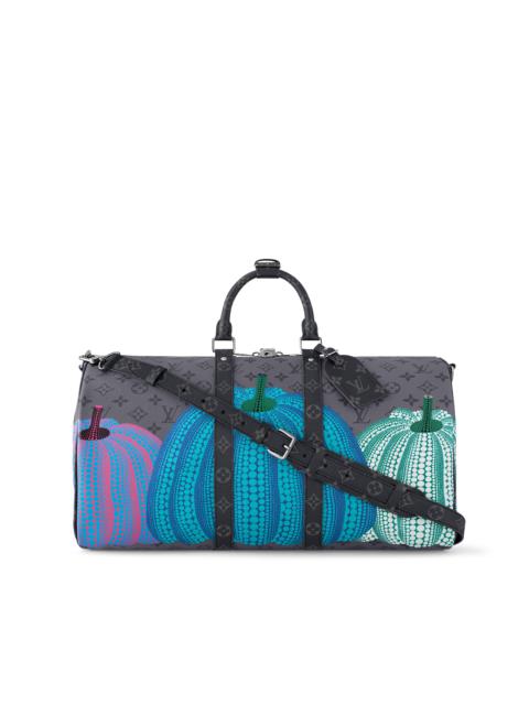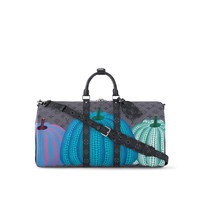 The Louis Vuitton x Yayoi Kusama collection features a vibrant update of a House classic: the LVxYK Keepall 55 is crafted in Monogram Eclipse Reverse canvas adorned with colorful pumpkins, an emblematic theme in Kusama’s work. The venerated artist began drawing pumpkins as a child, later using them in her paintings and sculptures as a symbol of warmth and reassurance. Here they transform a practical bag into an artistic collector’s piece. Detailed Features - Monogram Eclipse Reverse coated canvas with colorful Pumpkin print - Cowhide-leather trim - Textile lining - Ruthenium-color hardware - Inside LVxYK signature - Large capacity - Double zipped closure with padlock - Inside zipped pocket - Removable leather name tag - Strap:Removable, adjustable - Strap drop: 14.2 inches - Strap drop max: 19.7 inches - Handle:Double Length: 21.7 inches Height: 12.2 inches Width: 10.2 inches