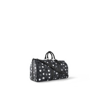 The LVxYK Keepall 55 joins the exceptional new Louis Vuitton x Yayoi Kusama collection, a celebration of art and high-level craftsmanship. Even as a child, the eminent Japanese artist was fascinated by dots, seeing them as an expression of uncertainty. A recurring element in her work, dots adorn this version of the LVxYK Keepall in gray tones on Monogram Eclipse canvas, turning an elegant and practical bag into a creative collector’s item. Detailed Features - Monogram Eclipse coated canvas with 3D Painted Dots print - Cowhide-leather trim - Cotton and polyester lining - Black hardware - Inside LVxYK signature - Large capacity - Double zipped closure with padlock - Inside zipped pocket - Leather name tag - Strap:Removable, adjustable - Strap drop: 14.2 inches - Strap drop max: 19.7 inches - Handle:Double Length: 21.7 inches Height: 12.2 inches Width: 10.2 inches
