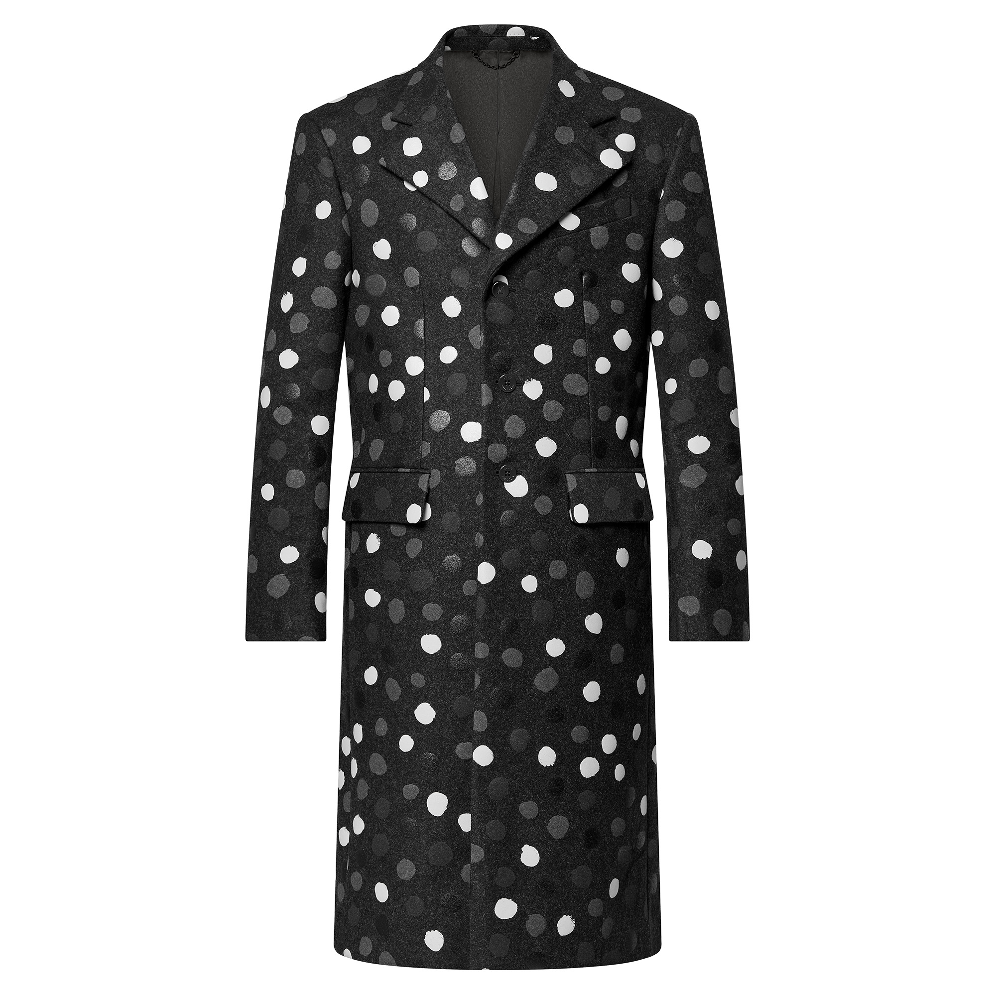This tailored wool coat is from the first drop of the Louis Vuitton x Yayoi Kusama collaboration. The dark grey, structured, single-breasted piece is twisted with the artist’s playful dots, which have been printed all over in lustrous grey tones with a subtle relief effect, faithfully reproducing her signature hand-painted brushstrokes. This fully lined piece is finished with a three-button closure with LV stitching on the top button. Detailed Features - 100% Wool - Sea Lion Grey - Regular Fit - Made in Italy