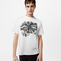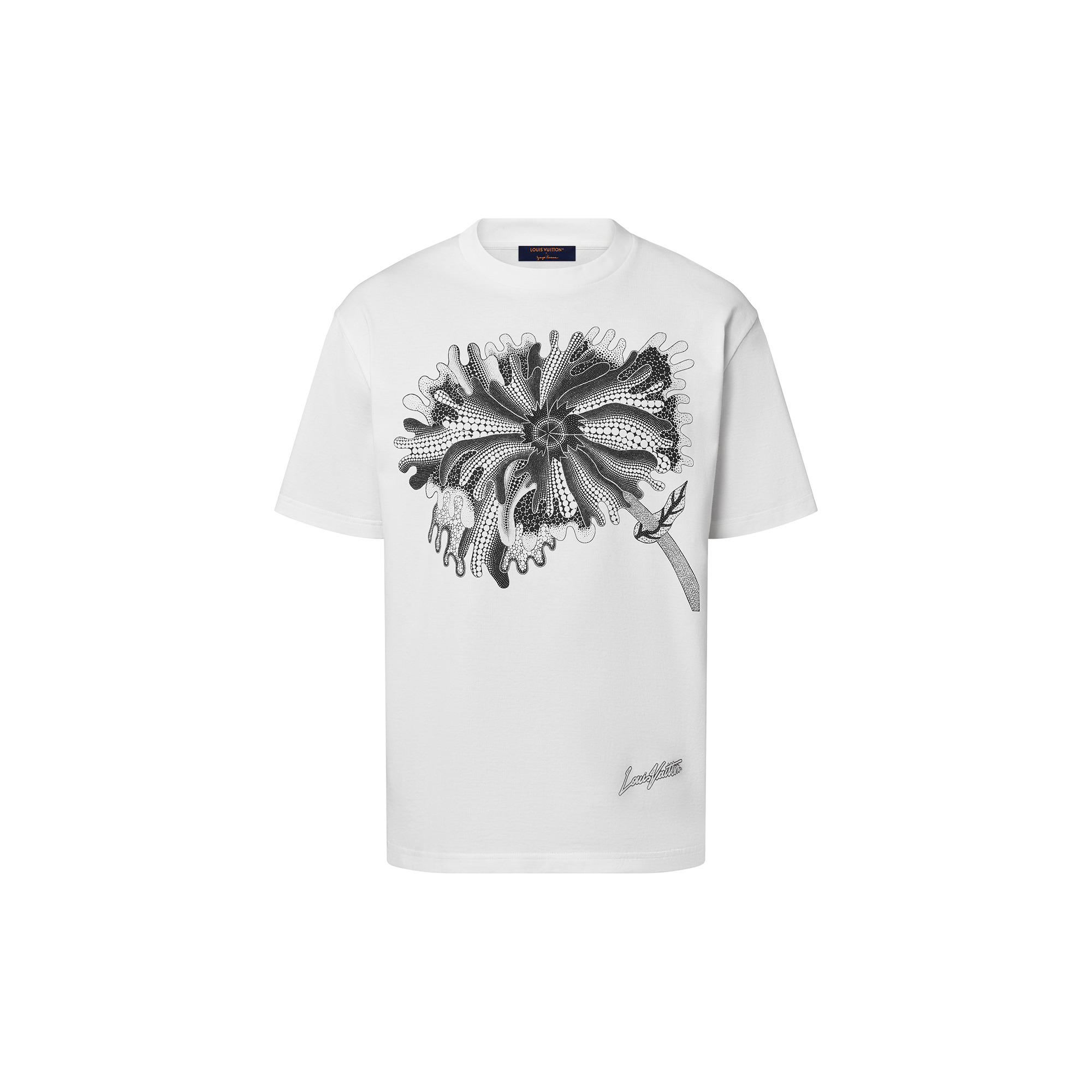 This white t-shirt from the Louis Vuitton x Yayoi Kusama collection is embellished with the artist’s signature Psychedelic Flower motif. Here, the flower is printed across the chest in black, creating a bold, graphic look. A handwritten-effect Louis Vuitton signature on the bottom left completes this casual piece. Detailed Features - 100% Cotton - Milky White - Regular Fit - Made in Italy