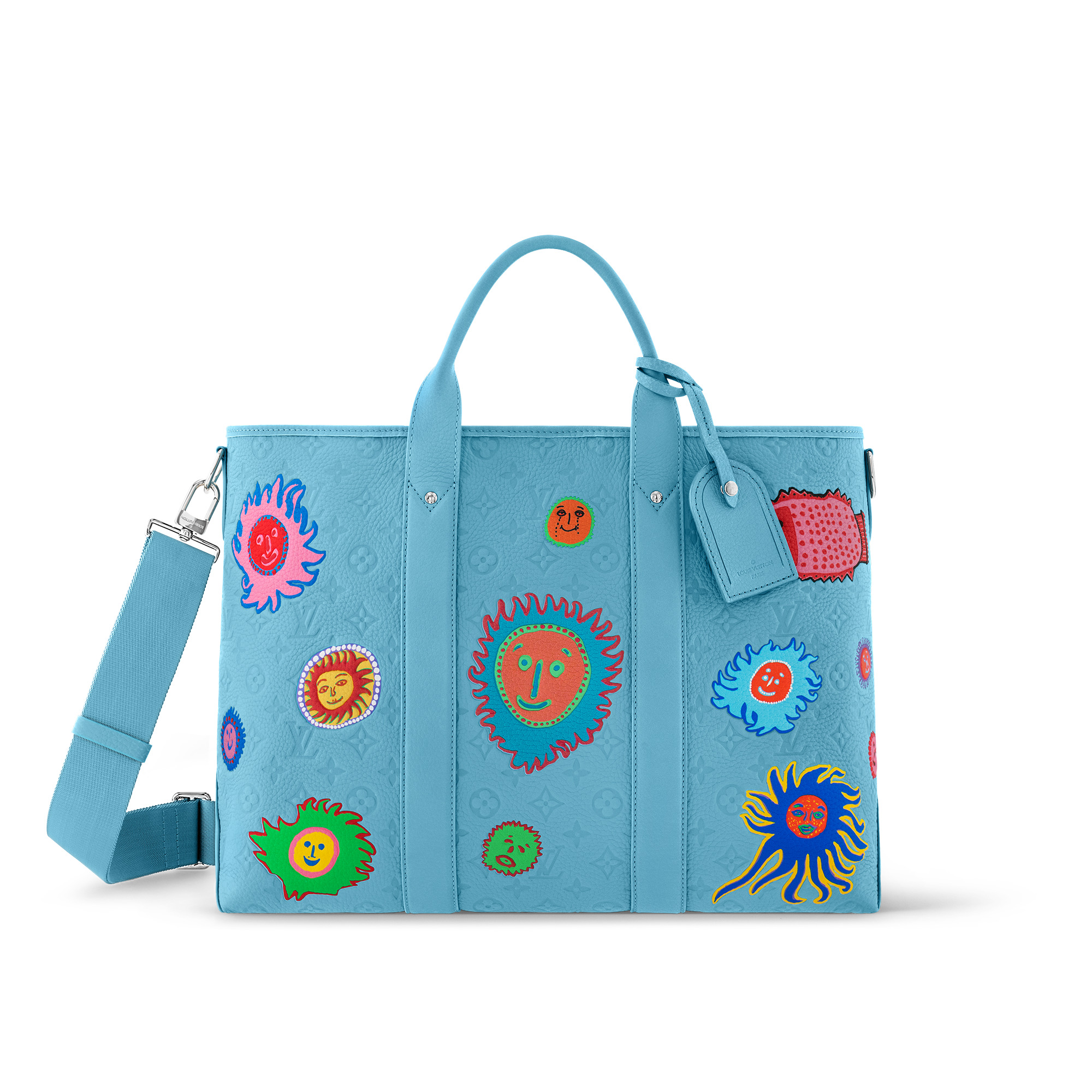 For the second Louis Vuitton x Yayoi Kusama collaboration, the artist and the House’s design team selected their favorite images from “My Eternal Soul,” a series of paintings that Kusama began in 2009. The result is the “Faces” theme, including this version of the LVxYK Weekend Tote, crafted in cool blue Taurillon Monogram cowhide enlivened with joyful, colorful faces and organic shapes. A fun bag and a unique collector’s item. Detailed Features - Blue - Taurillon Monogram embossed cowhide leather with colorful Faces appliqués - Taurillon cowhide-leather trim - Textile lining - Palladium-color hardware - Inside LVxYK signature - Spacious main compartment - Inside flat pocket with zipped compartment - Strap:Removable, adjustable - Strap drop: 15.0 inches - Strap drop max: 29.5 inches - Handle:Double Length: 16.9 inches Height: 13.4 inches Width: 6.9 inches