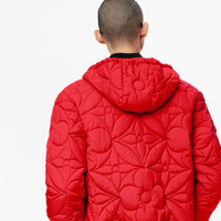 This piece offers a quilted take on the iconic Louis Vuitton Monogram motif. Crafted in a regular fit from recycled technical fabric with a shiny finish, it features a plain lining and knitted ribs at the waist and cuffs. A hidden round pocket melting into the motif on the chest adds an extra twist. Detailed Features - 100% Polyester - Rio Red - Regular Fit - Model wears a FR 50 size - Made in France