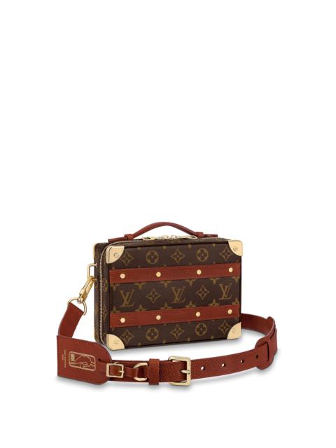 With its boxy shape, gold-color metallic corners, and rivets, the small Handle Trunk bag evokes Louis Vuitton’s iconic trunks. The leather top handle brings an added vintage feel while the removable leather strap enables shoulder carry. The two zip pulls give easy access to an interior large enough for a phone and wallet. Detailed Features - Monogram coated canvas - Textile lining - Ball Grained leather trim - Gold-color hardware - Front flat pocket - Leather tag - Removable and adjustable strap - Inside flat pocket - Strap:Removable, adjustable - Strap drop: 17.5 inches - Strap drop max: 22.8 inches - Handle:Single - This reference is either Made in France, Spain, Italy or in the US. Length: 8.5 inches Height: 5.9 inches Width: 2.8 inches