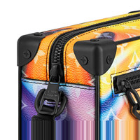 Inspired by the House’s trunkmaking past, Virgil Abloh created the Mini Soft Trunk bag for men. With a shape evocative of Louis Vuitton’s historic trunks, the Mini Soft Trunk is made from Monogram Sunset canvas, a tie-dye sunset colorway of pinks and blues and everything in between. The contrasting matte-black hardware brings a masculine feel. Detailed Features - Monogram Sunset coated canvas - Textile lining - Cowhide-leather trim - Matte-black hardware - Outside zipped pocket - Inside flat pocket - The dye artwork design was created by and is licensed from Daniel Cascarella. - Strap:Not removable, adjustable - Strap drop: 16.5 inches - Strap drop max: 22.8 inches - This reference is either Made in France, Spain, Italy or in the US. Length: 7.3 inches Height: 5.1 inches Width: 3.1 inches