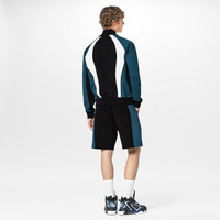 These sporty shorts have a bold, graphic look thanks to their irregular vertical white leather stripes that contrast with intarsia blocks of deep color in the compact cotton knit. They feature an elasticated waist with cordons and are signed with an embossed LV on the front. Worn with the matching tracksuit top they make a dynamic total look. Detailed Features - 100% Cotton - Gray Blue - Regular Fit - Model wears a FR M size - Model measurements : chest 33’’ / 85 cm, height 6' 2’’ / 188 cm - Made in Italy