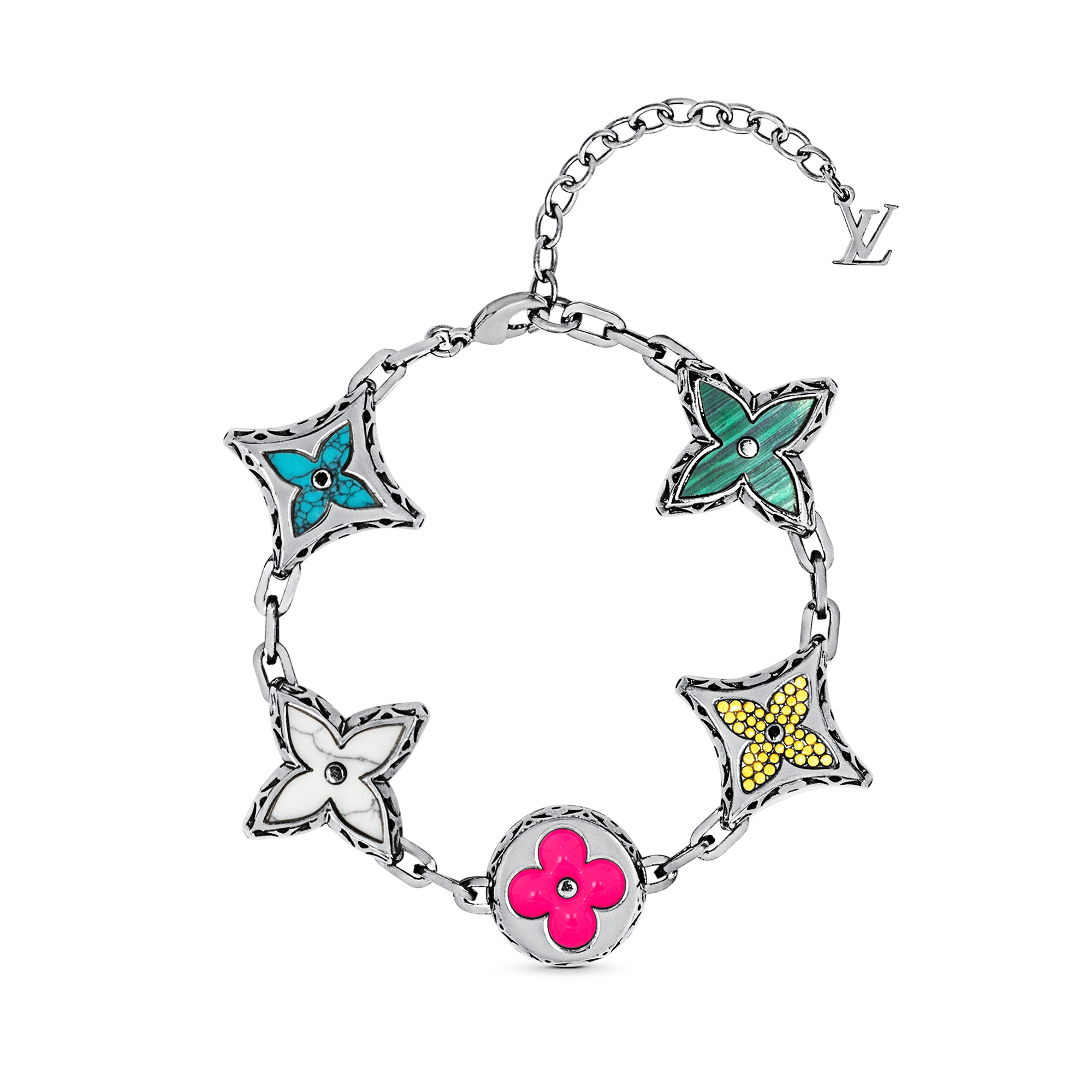 The MNG Big Party Bracelet features an assortment of vibrant Monogram Flower beads to create a whimsical aesthetic. The combination of colourful enamel, stone-effect resin, crystal and intricate metalwork exhibits the House's commitment to craftsmanship. An adjustable chain with an LV Initials charm completes this striking piece of jewellery. Detailed Features - Multicoloured - Metal with silver-colour finish - Stone-effect resin - Crystal - Enamel - Monogram Flower beads - LV Initials charm - Clasp closure - Adjustable - Made in Italy