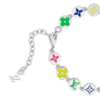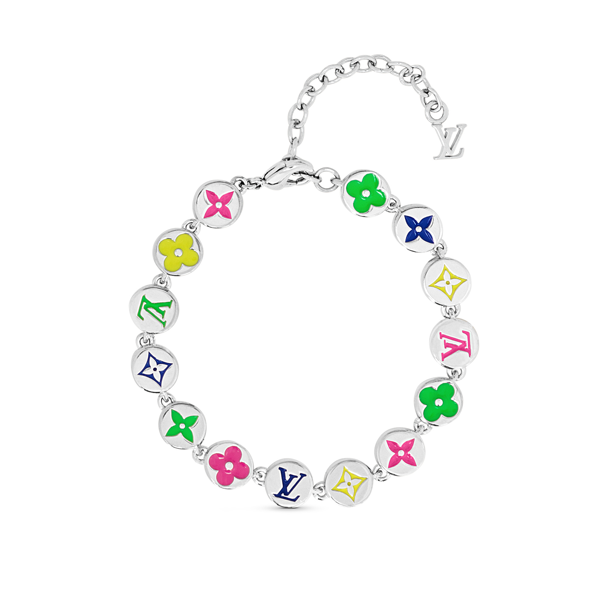 This season, the Monogram Colours Bracelet brings a burst of brightness to relaxed summer looks. Finely fashioned metal beads feature enamelled LV and Monogram Flower motifs in a rainbow of mood-lifting hues. The bracelet’s adjustable, silver-tone chain sports a small, circular LV charm, giving a final signature touch to this playful, stylish accessory. Detailed Features - Multicoloured - Metal beads - Enamel - Silver-colour chain - LV charm - Made in Italy