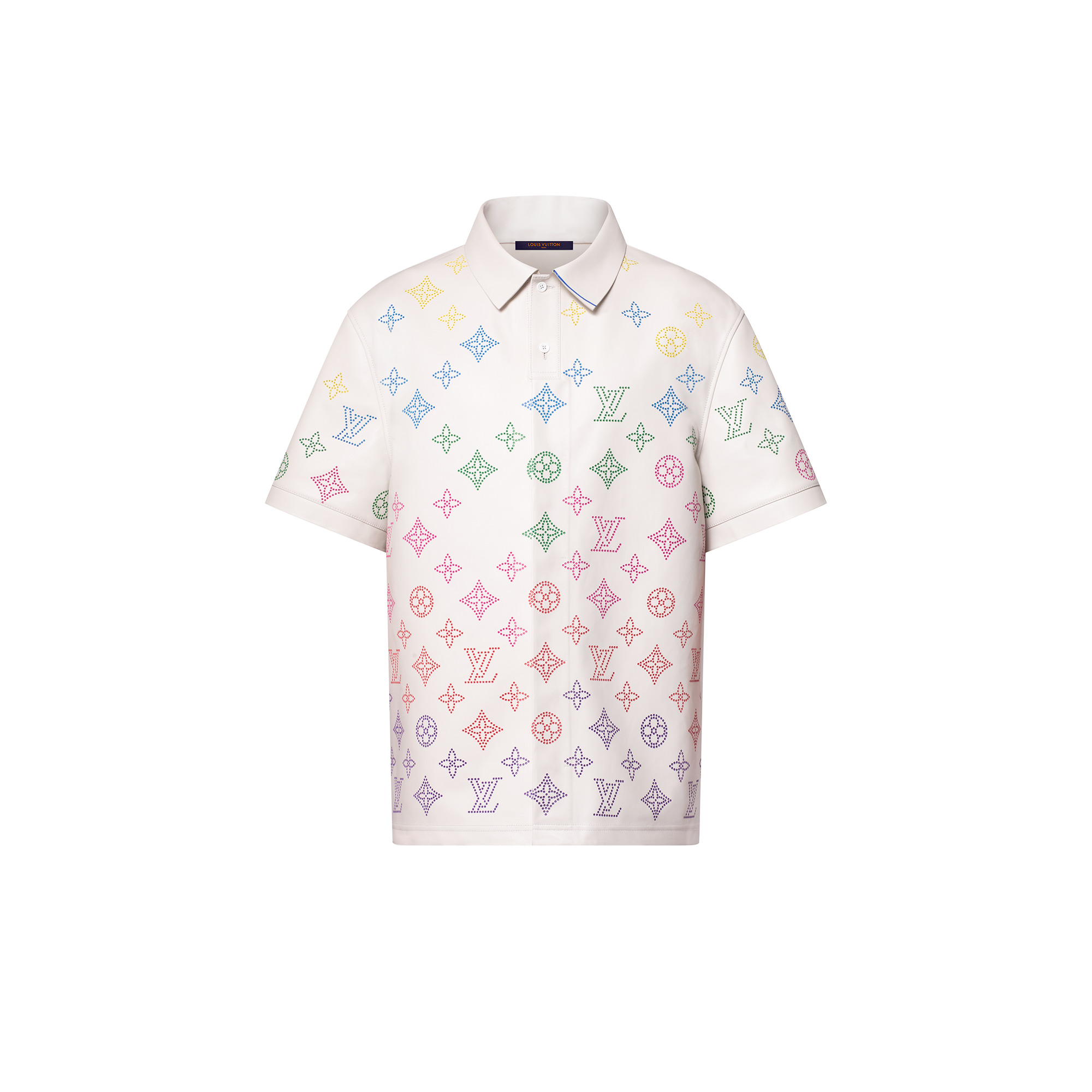 This short-sleeved polo shirt in cream-colored lambskin is an effortlessly sophisticated piece for spring. The relaxed silhouette is meticulously handcrafted with a laser-perforated Monogram Flower motif, with vibrant colors in a gradient effect that disperses towards the shoulders. An elegant concealed button placket with two visible top buttons creates a trompe-l’oeil polo shirt effect. - Relaxed fit - Multicolor - 100% Lamb Leather - Concealed button placket with two visible top buttons - Perforated signature motif - Made in Italy