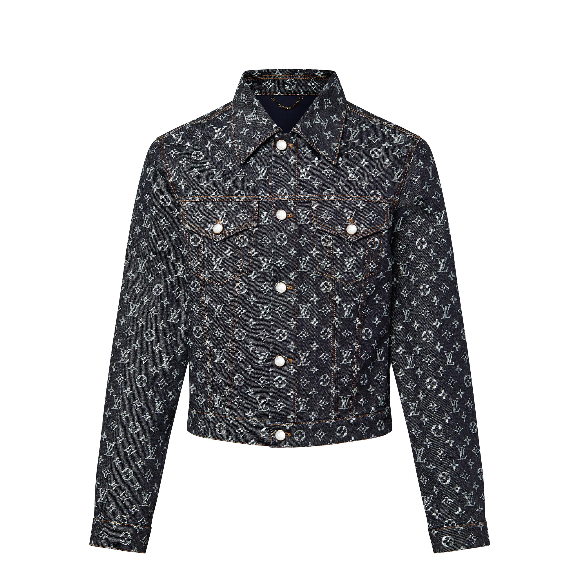 This dark indigo denim trucker jacket is crafted with a contrasting Monogram jacquard creating a bold signature effect. Pearl-effect buttons on the closure, pockets and cuffs lend a sophisticated dandy twist. This versatile transeasonal piece brings a graphic touch to everyday ensembles, and can also be paired with matching skate pants for a total look. - Regular Fit - Monogram allover jacquard - Pearl-effect buttons - Two buttoned chest flap pockets - Adjustable waist - Buttoned cuffs - Indigo - 100% Cotton - Made in France
