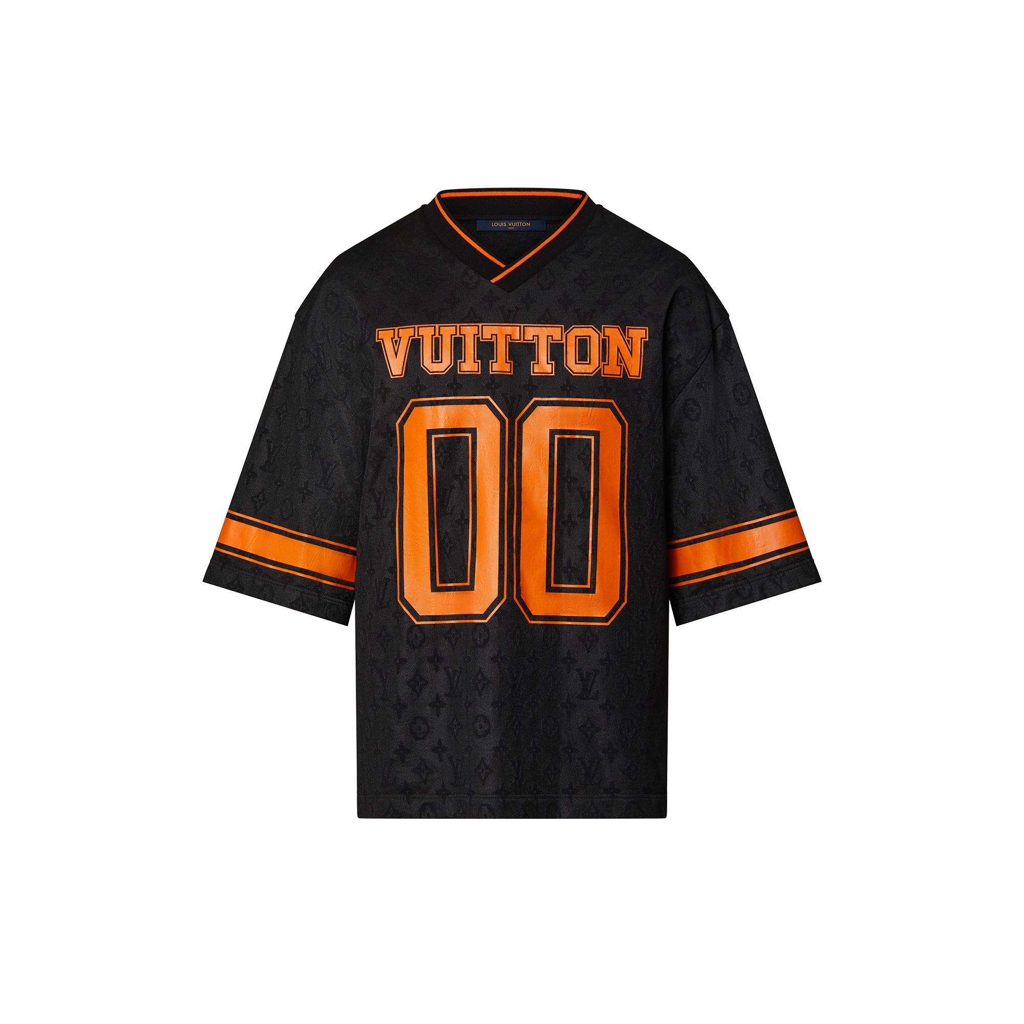 This American football-inspired black V-neck t-shirt is made from light cotton piqué with an allover jacquard Monogram. It is emblazoned with Vuitton signatures and bold stripes in a vibrant orange print for a sporty effect. An inside-out label at the back adds a final signature. Detailed Features - 55% GOTS-Certified Cotton, 45% Polyester - Black - Loose Fit - Model wears a FR M size - Model measurements : chest 36’’ / 92 cm, height 6' 2½’’ / 189 cm - Made in Italy