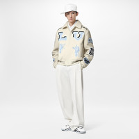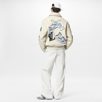 This lively take on the varsity blouson has grained LWG leather certified calfskin sleeves and a wool body. Graphic House signatures and playful cartoon motifs are applied to both the body and arms with bouclette embroidered patches. Details include a shirt collar and striped wool ribs on the cuffs and bottom hem. Detailed Features - 100% LWG Leather Certified Calf Leather - Milky White - Relaxed Fit - Model wears a FR 50 size - Model measurements : chest 33’’ / 84 cm, height 6’’/ 183 cm - Made in France