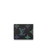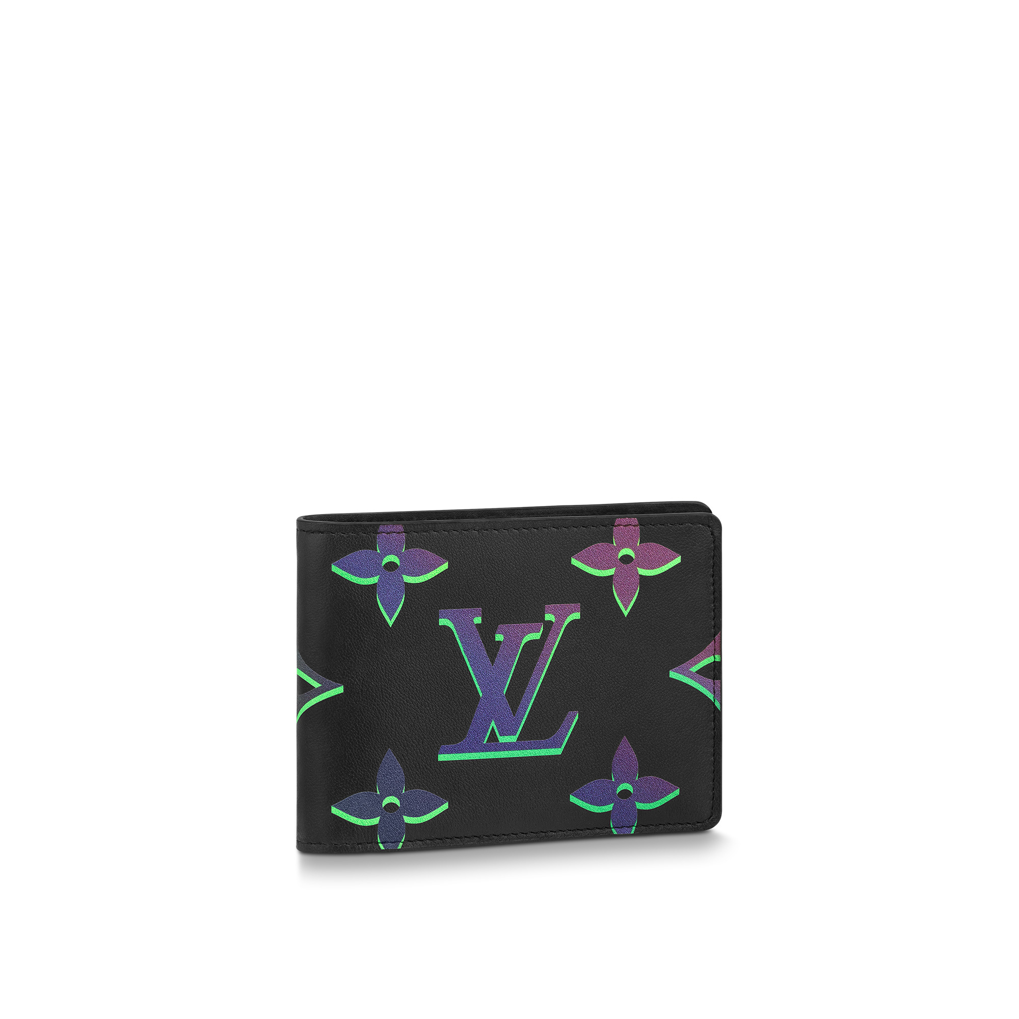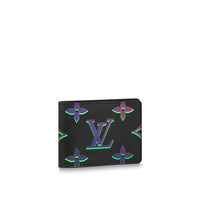 The Multiple Wallet is fashioned from extra-supple and smooth calfskin adorned with the Monogram Spotlight print. The Monogram Flowers and LVs seem to emit vivid neon echoes of themselves. Functional and sophisticated, the Multiple slips easily into most pockets. Detailed Features - Black Borealis - Calf leather - Textile lining - Black-color hardware - 3 card slots - 2 inside pockets - 2 compartments for bills and tickets - 2 side slots for receipts - This reference is either Made in France, Spain, Italy or in the US. Length: 4.5 inches Height: 3.5 inches Width: 0.6 inches