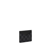 Part of the city chic Damier Graphite collection, this compact vertical card holder has two slots for credit cards, transport or business cards. It slips easily into a jacket or pants pocket. Detailed Features - Coated Canvas - Cross Calf Leather lining - 5 cards slots - This reference is either Made in France, Spain, Italy or in the US. Length: 4.3 inches Height: 3 inches Width: 0.4 inches