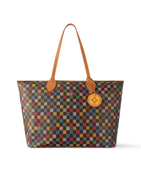 The Nevereverfull is an XL format carryall bag made from LV Vers Damier Ebene coated canvas, Pharrell Williams’ multicolored reimagining of the original Damier Ebene's black-and-brown colorway. Ultra-practical, the lightweight Nevereverfull closes with pearl zip-pulls, keeping belongings secure. There’s a removable leather pouch inside. It’s signed with a removable LV Vers UNITED tag. Length: 23.6 inches Height: 15.0 inches Width: 9.1 inches - Multicolor - LV Vers Damier Ebene coated canvas - Cowhide-leather trim - Textile lining - Gold-toned hardware - Removable LV Vers UNITED tag - Removable name tag - Double zip closure - Inside zipped pocket - Removable pouch - Handle:Double This reference is either Made in France, Spain, Italy or in the US.