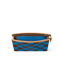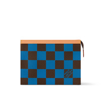 With Damier Pop coated canvas, Creative Director Pharrell Williams brings bold primary-color optimism to the Pochette Voyage. Paired with natural leather along the top and on the gussets, this functional pouch can be carried as a clutch or used inside a larger bag. The interior has a flat pocket and six card slots. Length: 10.6 inches Height: 8.3 inches Width: 2.4 inches - Blue - Damier Pop coated canvas - Natural cowhide-leather trim - Textile lining - Gold-color hardware - Zipped closure - 6 card slots - Inside flat pocket This reference is either Made in France, Spain, Italy or in the US.