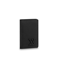 The new LV Aerogram version of the Pocket Organizer is styled in black calf leather as fine and soft as an old-fashioned aerogram. Adorned with the “LV” initials in black metal for a low-key signature touch, it’s both elegant and functional, offering an array of compartments and card slots. An ideal complement to any of the LV Aerogram bags. Detailed Features - Black grained calf leather - Cowhide-leather trim - Textile lining - Signature metal initials - 3 card slots - 5 inside pockets - Outside flat pocket - The reference is either made in France, Spain, Italy or in the US. Length: 3 inches Height: 4.4 inches Width: 0.4 inches