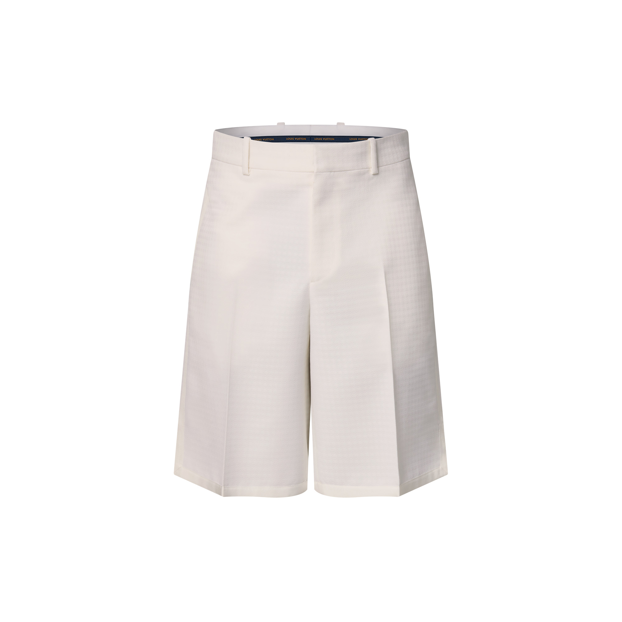 These tailored white shorts crafted from fine Vichy jacquard wool have a preppy tennis vibe with their grosgrain ribbon trim. A cursive rhinestone Louis Vuitton signature in graduated colors lends a sophisticated accent to the rear pocket. These summery shorts can be paired with a matching jacket for an elegant and contemporary look. - Regular fit - Milky White - 100% Wool - Tone-on-tone grosgrain trim - Lined - 2 side pockets - 2 rear patch pockets - Rhinestone signature on rear pocket - Made in Italy
