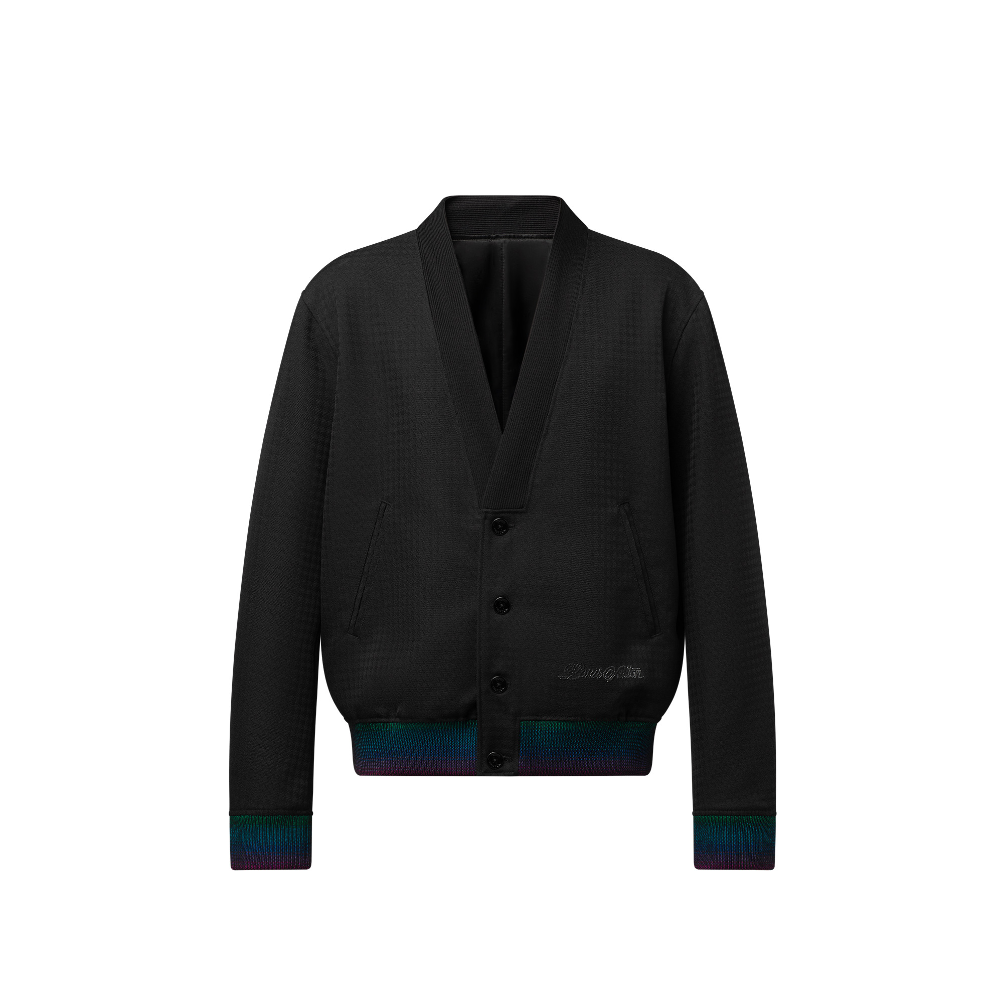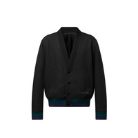A chic twist on a cardigan, this preppy blouson is crafted from black Vichy jacquard wool. It is adorned with iridescent ribbing in vibrant colors on the cuffs and waist, while a multicolor glittering rhinestone Louis Vuitton signature in an elegant cursive script adorns the bottom left. This fashion-forward piece elevates casual day-to-evening looks. - Regular fit - Black - 100% Wool - Tone-on-tone Vichy jacquard - Gradient ribbing on cuffs and waist - Lined - Button fastening - 2 piped pockets on the front - Multicolor Rhinestone signature - Made in France