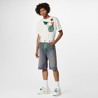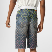 These trendy indigo denim shorts are twisted with a jacquard weave featuring an allover Rainbow Monogram signature in graded pastel shades of green, yellow and pink. They have been washed for a lived-in effect, have an LV jacqueron at the back, and can be paired with a matching shirt for a total look. Detailed Features - 100% Cotton - Indigo - Regular Fit - Model wears a FR 30 size - Model measurements : chest 32’’ / 82 cm, height 6’’ / 183 cm - Made in Italy