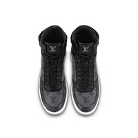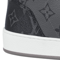 One of Louis Vuitton's signature styles, the Rivoli sneaker boot is revisited in Eclipse Monogram and Monogram Reverse canvas. This classic hi-top features a velcro strap, which can be worn at the front or back. It is finished with black leather trim, a white rubber outsole and the LV Initials in silver on the tongue. Detailed Features - Eclipse - Monogram and Monogram Reverse canvas - Rubber outsole - Louis Vuitton signature on the strap - LV Initials on the tongue - Made in Italy