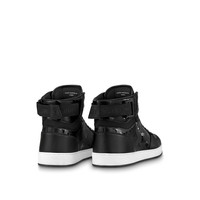 This version of the Rivoli sneaker boot combines calf leather with Monogram metallic canvas, which is a key theme of the season. This classic hi-top has a padded collar for comfort and a shape-memory anatomic insole, which can be removed to dry. The velcro strap with the Louis Vuitton signature can be worn at the front or back of the sneaker. Detailed Features - Black - Calf leather and Monogram metallic canvas - Removable, shape-memory anatomic insole - Rubber outsole - LV Initials on the tongue - Louis Vuitton signature on the strap - Made in Italy