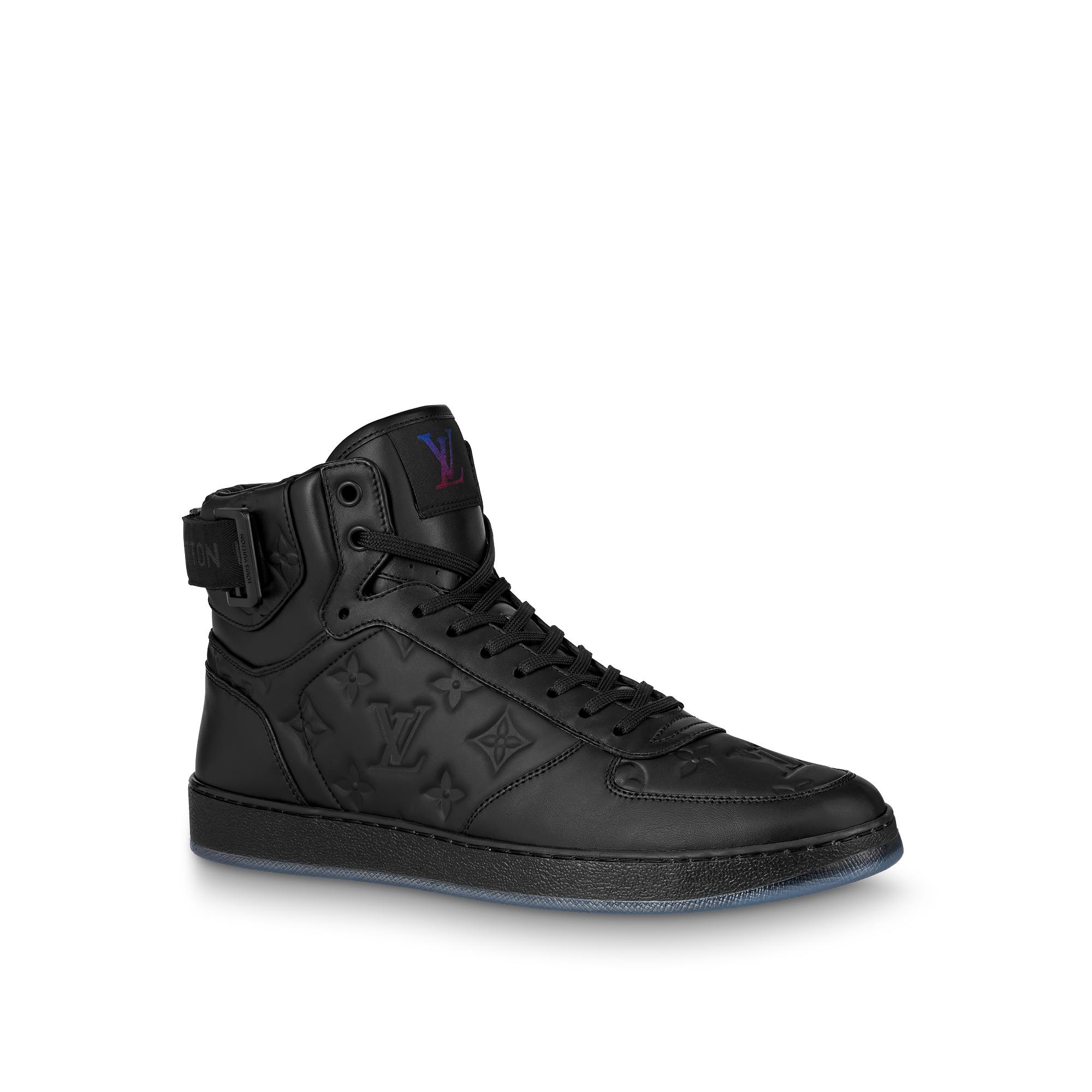 The Rivoli sneaker boot comes in canvas embossed with Louis Vuitton's signature Monogram pattern. This classic hi-top is characterized by its signed velcro strap, which ensures easy fitting and can be worn at the front or back of the shoe. A transparent rubber outsole completes this design. Detailed Features - Black - Monogram-embossed canvas - Rubber outsole - LV Initials on the tongue - Louis Vuitton signature on the strap - Made in Italy
