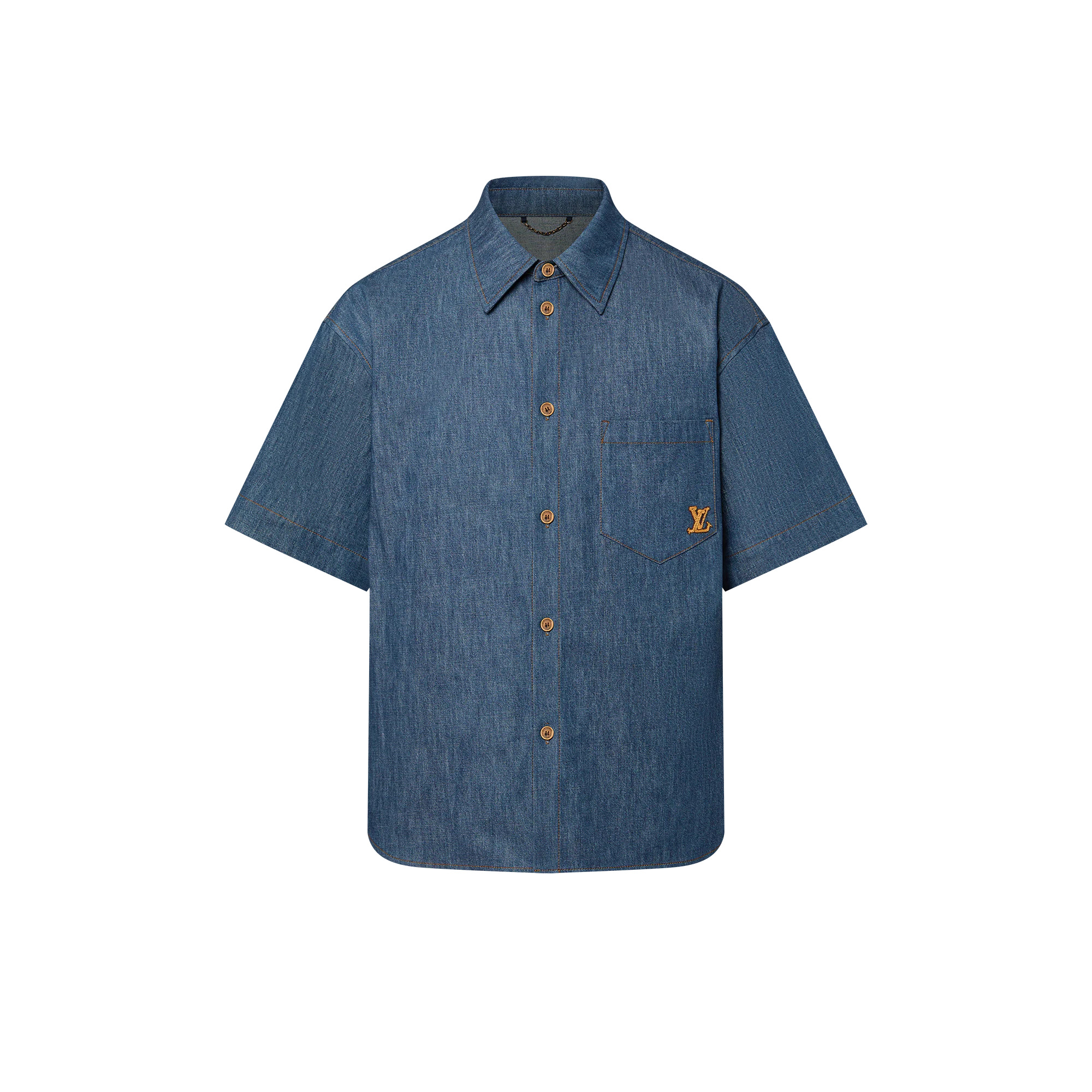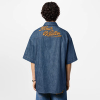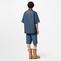 This short-sleeved shirt constructed from indigo chambray has a relaxed Fit for hot summer days. Inspired by the FW24 Show’s Western aesthetic, it is embellished with lasso-inspired LV Ropes-embroidered signature patches, and can be paired with matching shorts for a breezy buy-now-wear-now set. - Relaxed Fit - LV Ropes embroidered rope-effect LV patch on chest pocket - LV Ropes embroidered rope-effect Louis Vuitton patch across back yoke - Patch pocket on left chest - Contrasting top-stitching - Indigo - 100% Cotton - Made in Italy
