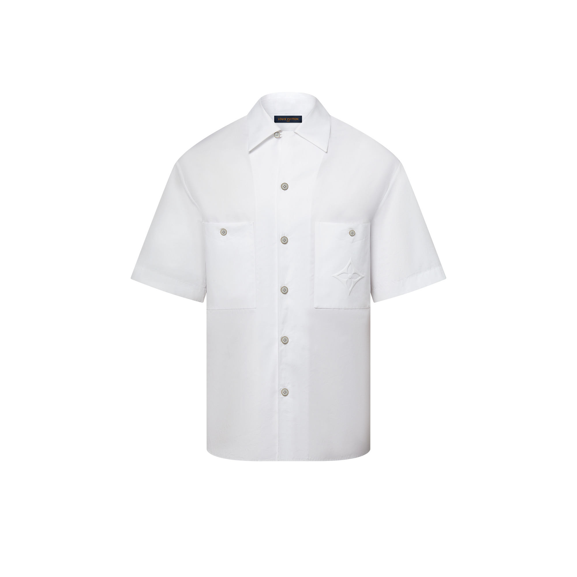 This crisp white short-sleeved shirt, crafted from organic cotton poplin, is a versatile design for casual and smart occasions. It features two buttoned patch pockets on the chest, with an embossed Monogram flower detail on the left. Mother-of-pearl effect buttons in gold-toned metal settings add a chic finishing touch. - Regular fit - White - 100% Cotton - Back yoke with pleat - Mother-of-pearl button fastening - 2 chest pockets - Embossed signature on front pocket - Tone-on-tone embossed LV on the back - Made in Italy